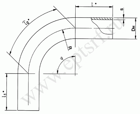 | Исполнение | Условный проход Ду, мм | Dн | S | R | Угол гиба φ° | Развернутая длина гнутой части ℓ2* | Масса гнутой части, кг |