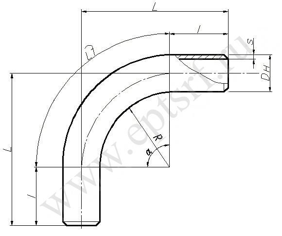 | Услов. проход ДУ | Наруж. диаметр Дн (мм) | Толщина стенки S (мм) | Радиус гиба R (мм) | Прямые участки [ l] (мм) | Строительная длина (L) | Масса отвода (кг) не более с углом гиба: | ||||||||