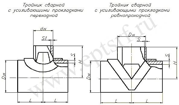 Тройники сварные с усиливающими накладками ТУ 1469-002-42039714-2004 с диаметром магистрали от 530 до 1420мм и диаметром ответвления от 219 до 1420мм, с рабочим давлением до 12,5 МПа, предназначенные для магистральных и промысловых трубопроводов, а также других объектов нефтяной и газовой промышленности, транспортирующих неагрессивные нефть, нефтепродукты и газ. Изготавливаются в двух исполнениях: УХЛ – для макроклиматических районов с умеренным и холодным климатом, У – для макроклиматических районов с умеренным климатом с коэффициентами условий работы штампосварных деталей m=0,6; 0,75, из сталей следующих классов прочности: К42, К46, К48, К50, К52, К54, К56, К60.